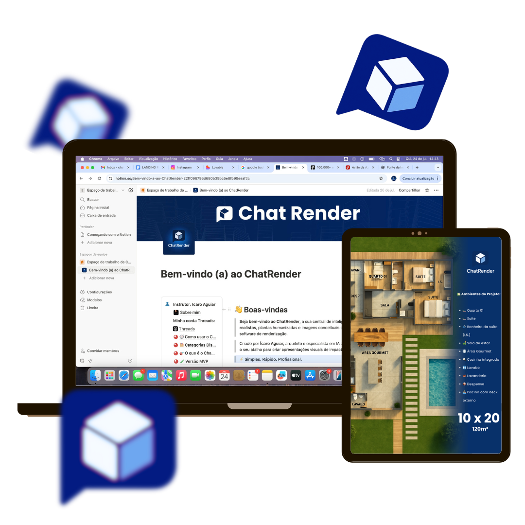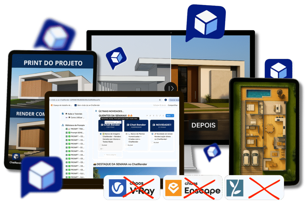 Com o ChatRender, você reduz drasticamente o tempo de produção, melhora suas apresentações e se destaca — sem precisar virar expert em nenhum programa.