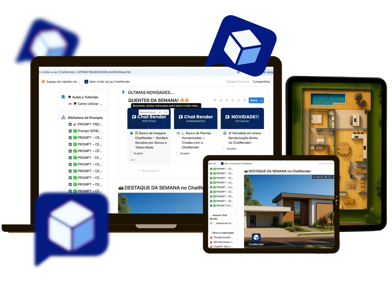 O ChatRender é um kit digital com prompts inteligentes prontos e videoaulas práticas que ensinam como gerar imagens realistas de projetos arquitetônicos usando o ChatGPT Plus com inteligência artificial. Você não precisa dominar softwares de renderização.Com os prompts certos e as instruções passo a passo, você transforma plantas, croquis e ideias em imagens de alto impacto visual em poucos minutos, direto no ChatGPT.